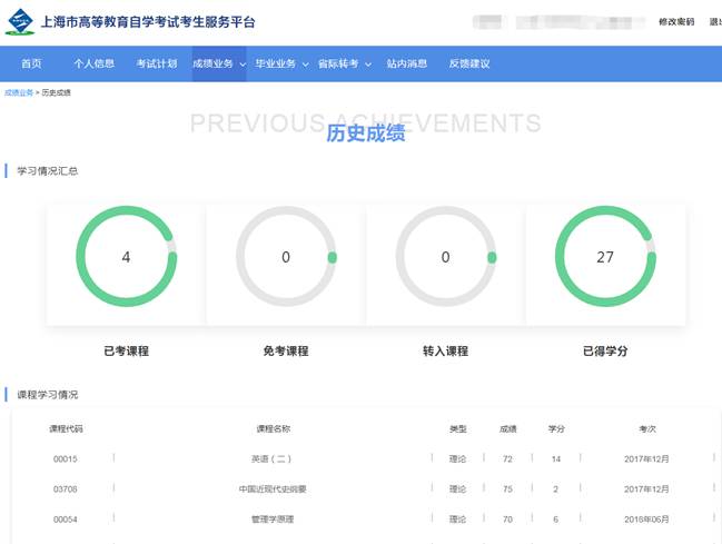 点击成绩菜单下的历史成绩,可以查询自己获取的历史成绩,如下图所示
