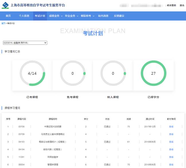 点击“考试计划”,考生可查看自己本专业的课程学习情况,如下图所示:
