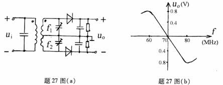 27.(本题5分)图(a)鉴频电路,上下两个回路谐振频率分别为f1、f2,现测得它的鉴频特性曲线如图(b)所示,输入信号ui=1.5cos(14×107πt+50sin2×105πt)V,求: